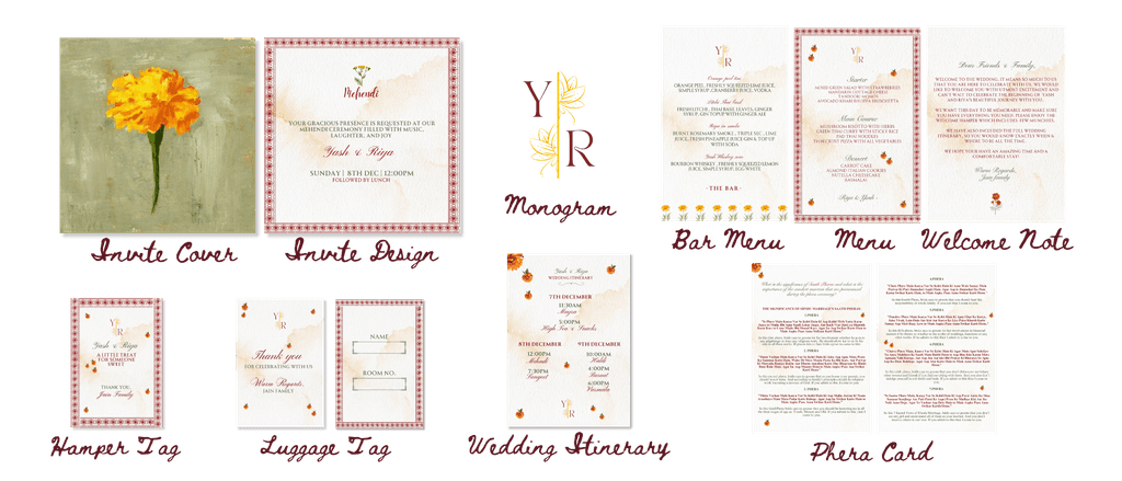 Their wedding, like their journey, bloomed in shades of saffron and gold. Inspired by the humble marigold, a flower of celebration, protection, and tradition, we crafted their wedding suite to echo the same warmth. From delicately illustrated ritual cards to thoughtful hamper tags, every element was steeped in sentiment and colour.